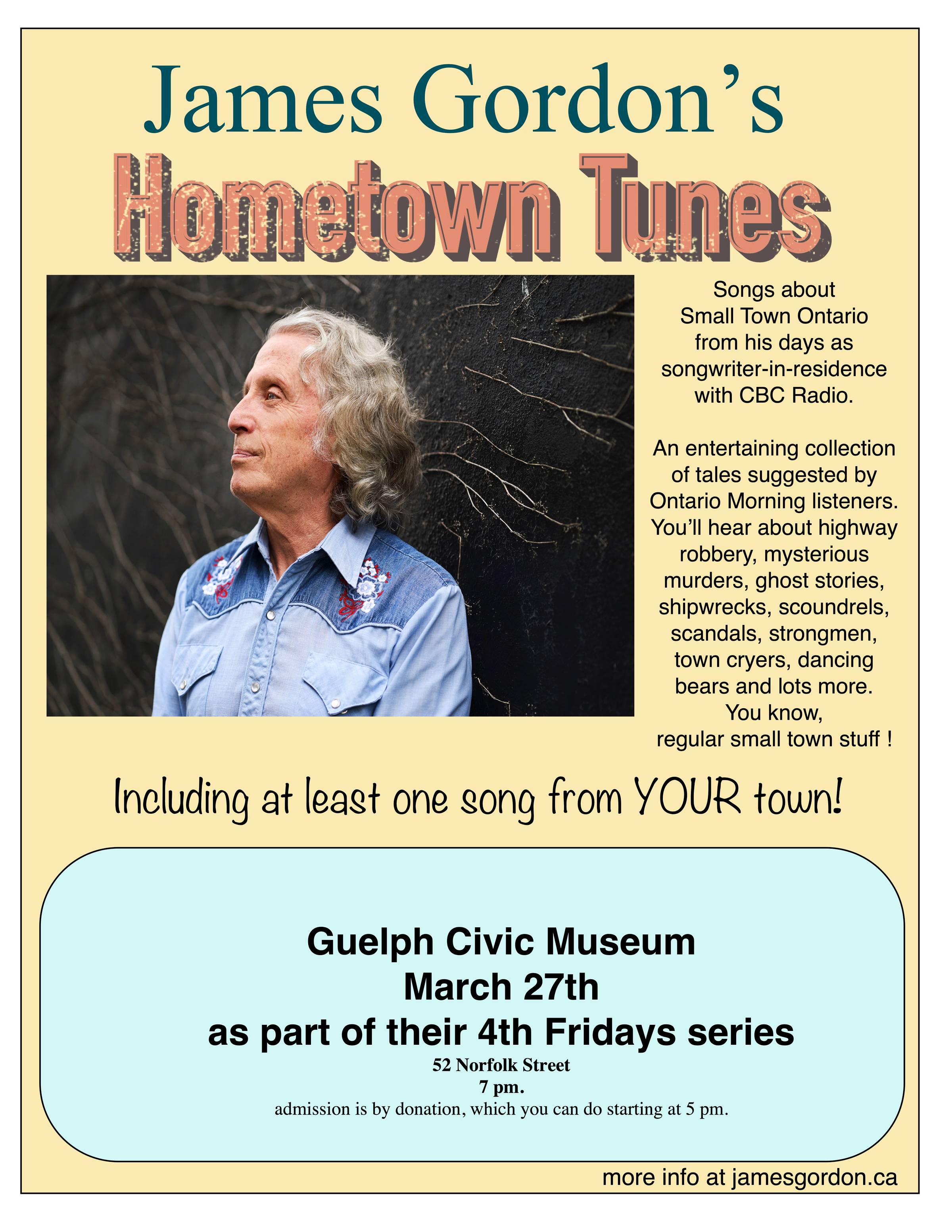 March 27th I'll be right here in Guelph with my "Hometown Tunes" show: songs from Small-Town Ontario as part of the "Fourth Friday" concerts at the civic museum, 52 Norfolk Street 7 pm. admission is by donation, which you can do starting at 5 pm. Come early as it tends to fill up. I've got a whole tour of museums and libraries coming up with this show, which features songs from my "Hometowns Tunes" feature on CBC Radio's Ontario Morning show.. 30 years ago! People would send me letters from their Ontario home towns - a songwriter's gift for sure, and I'd take the best ones, sprinkle Song Dust on them, and drive in to Toronto to perform live on the air, usually at 7 am! There are so many songs that only got performed once. I kept a banker's box of the letters and songs and I'm dusting them off for a revisit. Are you in Ontario? Chances are I have a song from your town! Let me know if you can think of a venue to bring you this show.