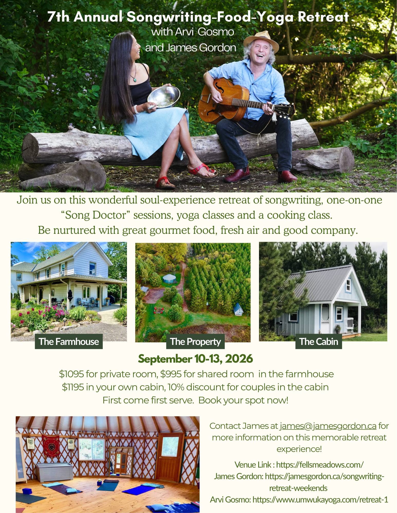 NEXT: I'm excited to announce that the 7th! Annual Arvi And James Songwriting -food-yoga retreat has a new home and a new time of year. We'll be at the incredible Fells Meadow Retreat Centre an hour east of Toronto Sept. 10th to 13th . It's An intimate gathering with just 15 of us on this gorgeous property. All the info is at https://jamesgordon.ca/songwriting-retreat-weekends No experience necessary! We also have the Wendi Hunter Bursary to offer to anyone who would benefit from the experience but who lacks the resources. Check out the joint at https://fellsmeadows.com/