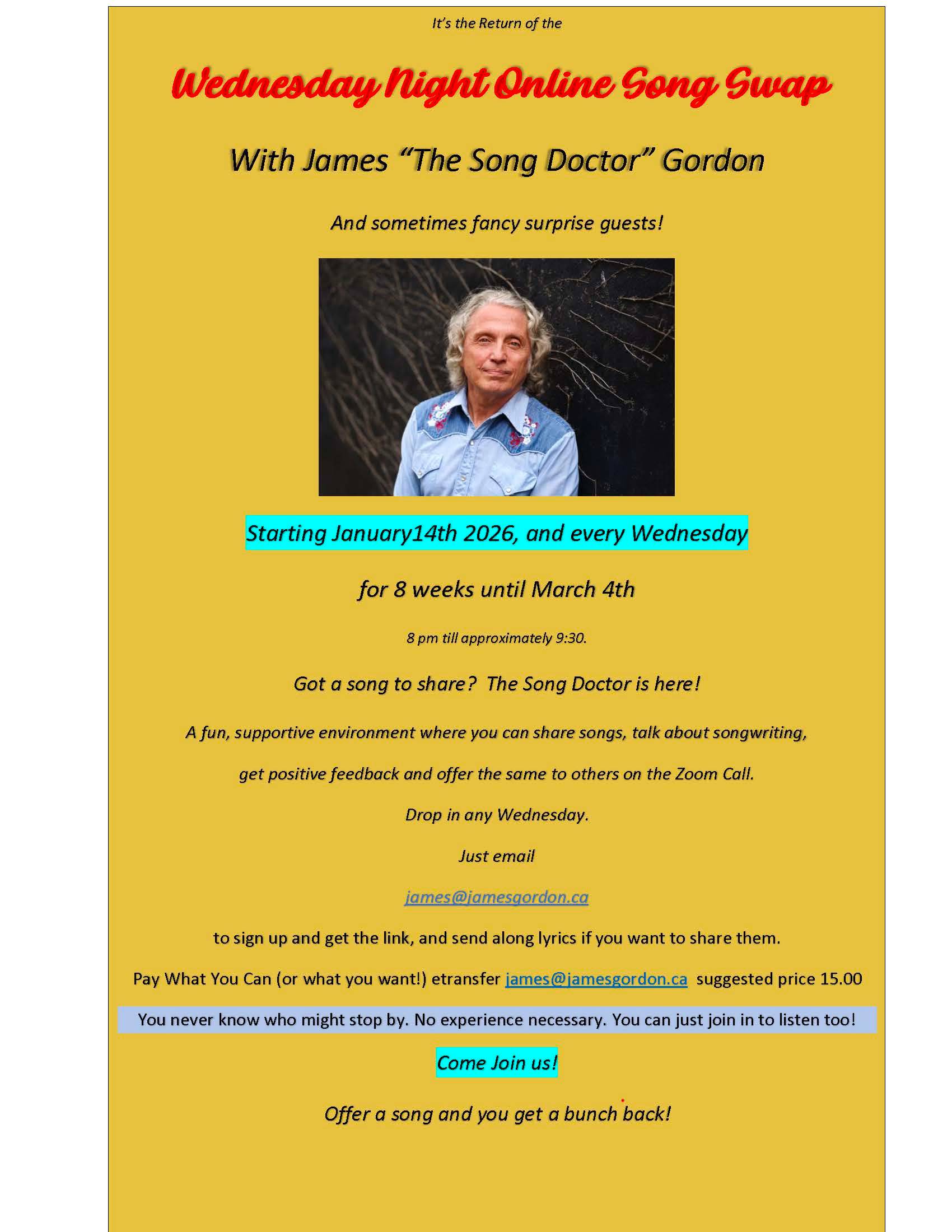 James Gordon March '26 Newsletter I'm a couple of days early with the March news, since there's an item of some urgency ( see below). Lots to share-including a new Songwriting Retreat weekend. Hope you all made it through what was a pretty brutal February. Here I am at the recent Winterfolk Festival in Toronto. The first time I wore my spiffy Rockabilly Vintage jacket from the awesome Currie's Music and Antiques in Gravenhurst ON. It seemed to draw more attention than my music. Maybe because...