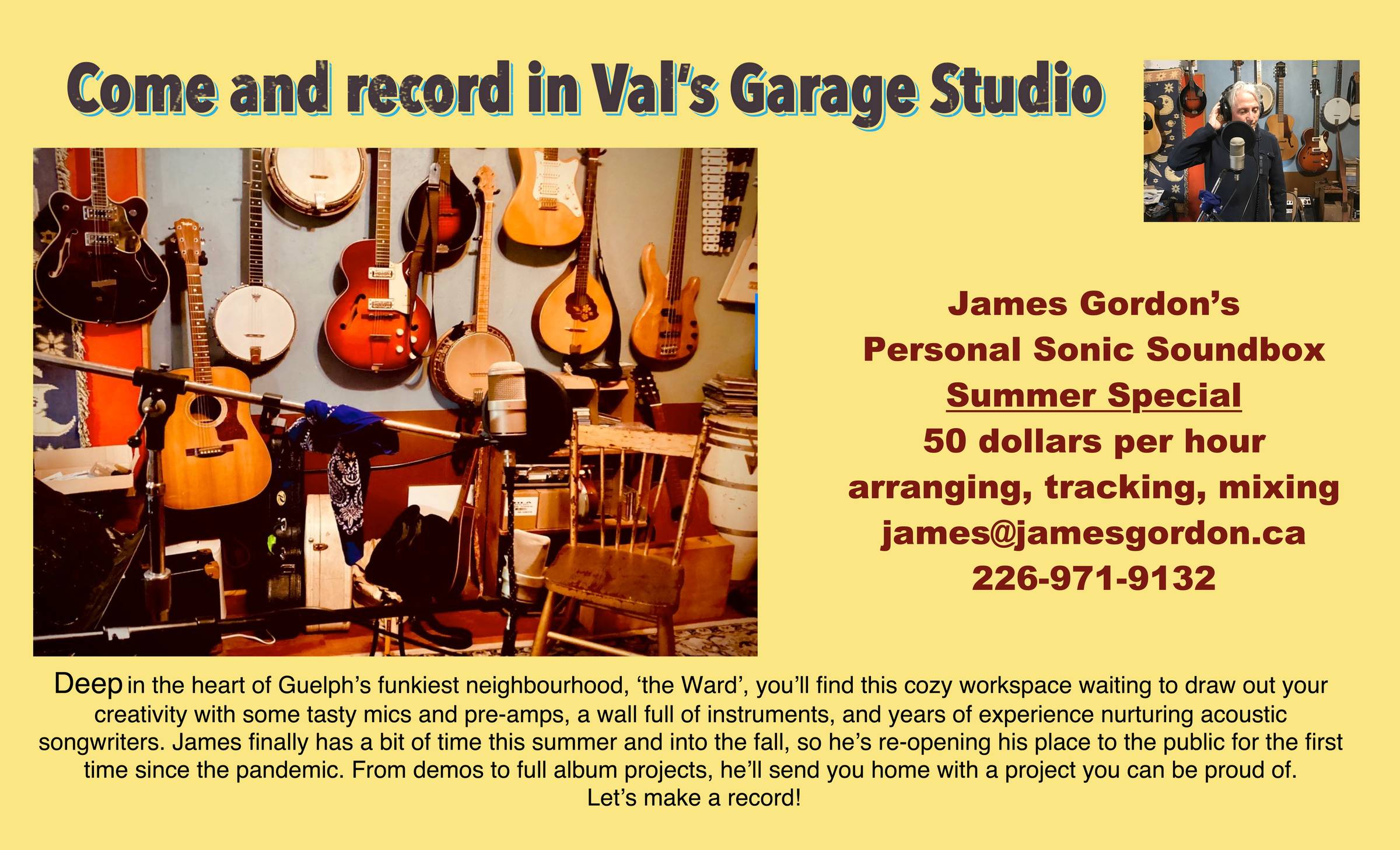 September '25 Hi Folks.. and happy Labour Day weekend. ( My American friends, I believe that all your troubles started when you dropped the 'u' in labour!) Hope you had a half decent August. I got to spend a good amount of time at my northern floating palace, the Eramosa Belle.. and I've got some new tunes to show for it that I'll be sharing anon. Here's a sunset shot taken from onboard the boat. The sky and the water were collaborating on an art installation . See below where I used this image for the lyric video to a song I wrote there. Just a few things to report for September starting with the GUELPH LABOUR DAY PICNIC Monday Sept 1st at the Riverside Park picnic area. 11 am to 2 pm.. free admission and there's food and refreshments. There are a number of local musicians. I'm not sure yet what my start time is.. so come and hang out! It looks like it's going to be a bright, yes a bright, sunshiny Day. Sept. 14th in the morning I'll be the guest speaker at the Unitarian Congregation, on York Road here in Guelph,. talking and singing about the value of community and heritage. Jeez I better get working on that! Sept 16th I'll be in Woodstock Ontario at the Woodstock Museum National Historic Site as part of their "Lunch And Learn" series at 11 am ... so if you make it through my presentation you get lunch as your prize! I'm getting kind historic myself so it's a good fit.. Here's the deal. Some of you Ontarians will remember that I had a weekly feature on CBC radio’s Ontario Morning show, called “Hometown Tunes” – where listeners would send in letters based on cool things about their towns, mostly small towns. I’d take the best letters and turn them presto chango into little ditties that I would perform live in the Toronto Studios each week, usually at 7:30 am! It so happens that two of those songs came from Woodstock, one juicy murder ballad and one about their legendary Town Crier. ( Why did they never have a Town Laugher?) So I’ll be talking about the process I went through creating the songs and sharing some of them. This is a test. I’ve saved all the letters from listeners and I’m slowly putting together a “Hometown Tunes” book, and I’d like to tour with that show when the book comes out. If you’re in Ontario, chances are I have a song about YOUR town. Then, back in Guelph, on Sept. 20th and 21st, it’s the 3rd annual Praise the Ward Festival, celebrating my own neighbourhood, The Ward. This funky part of town has so many musicians and artists that we though a good party was called for. I’m the artistic director, dontcha no. It’s a labour of love for my ‘hood. Lots of cool stuff to do for the whole family. Tickets and info at praisetheward.com You might spot me playing cornet with the Ward Marching Band and taking part in the big mashup jam session that closes Saturday night. Then I’ve got studio work and I’ll be prepping for my October tour of the not-so-united States of America. I know I know, some of you have expressed concerns about going in these troubled times. I’ve been touring there for over 40 years and I’ve always had a great connection with the folk scene there. So, if they let me over the border I’ll be returning for shows in New York, Pennsylvania, Maryland, Michigan and Wisconsin. I simply don’t want the bullies to win, and I’m honoured ( though I’ll be ‘honored’ there ) that the promoters are all welcoming the musical perspective I’ll be able to offer. I’ll go into more details next month, but you can see my itinerary on the website HERE. It wasn’t my intention, but as part of the trip I’ve been invited to perform my new one-man musical “Smashing The Oligarchy” close to the Belly of the Beast, Washington DC, at the Greenbelt Arts Centre. Now THAT’s going to be interesting! It saddens me to say it, but it may be my last trip to the U.S.- The regime of the Mad King has decreed that the work visas needed to perform there, which already cost a whopping 1000 dollars and took 6 months to get, are now going to be upwards of FOUR thousand dollars and take a year to process. Basically that’s just a way to say “don’t come”. Here’s hoping for so many reasons that things will change. Looking ahead, I’ll be heading to Canada’s Maritime provinces to do a short tour with Connie Murch. Still some dates to fill if any of you have any ideas. More about that next month. I’m grateful to you fine Newsletter receivers after I advertised my Studio Special for recording here at Val’s Garage. I’ve had a couple of great clients with more to come. I’m short on time for the fall now, but we could squeeze you in to this cozy space. AND.. for your Video of the month.. .just completed today, here's a lyric video of my new song "Caught Up In the Hurly Burly" . I think I managed to make it kinda pretty- needed in these ugly times. That's about it. Thanks as always for listening and reading. Always lots of updates on Facebook and on jamesgordon.ca And for your road tale of the month: heres's an American gig story since I'm heading there soon. It's from my "The Highway and I" collection of road stories. ( Why, wouldn't ya know, it's available, along with an overabundance of my books and recordings, at jamesgordonmusic.bandcamp.com) A tale about battling with a waterfall in Jackson Michigan, performing with my old friend Sandy Horne: Sandy and I travelled to Jackson, Michigan to give an afternoon concert at the “Cascades Park”. Jackson, birthplace of the Republican Party, seemed like a fairly typical Mid-American town. Typical, it turns out, except for “The Cascades”. Before making the trek, the promoter of the event had faxed an unusual inquiry. Apparently the stage for the performance was at the base of a waterfall. Did I want the waterfall turned on or off? I’m not often given this choice. In making my decision in this matter, I imagined that since this waterfall could be ‘turned on or off’- it must be